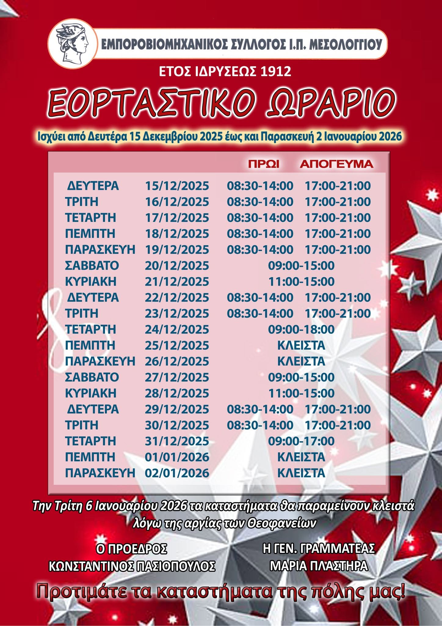 Ο Εμποροβιομηχανικός Σύλλογος Ι.Π. Μεσολογγίου έδωσε στη δημοσιότητα το εορταστικό ωράριο λειτουργίας των καταστημάτων για την περίοδο των Χριστουγέννων και της Πρωτοχρονιάς, το οποίο θα ισχύει από τη Δευτέρα 15 Δεκεμβρίου 2025 έως και την Παρασκευή 2 Ιανουαρίου 2026. Στόχος του Συλλόγου είναι η ομαλή εξυπηρέτηση του κοινού και η ενίσχυση της τοπικής αγοράς ενόψει των εορτών.