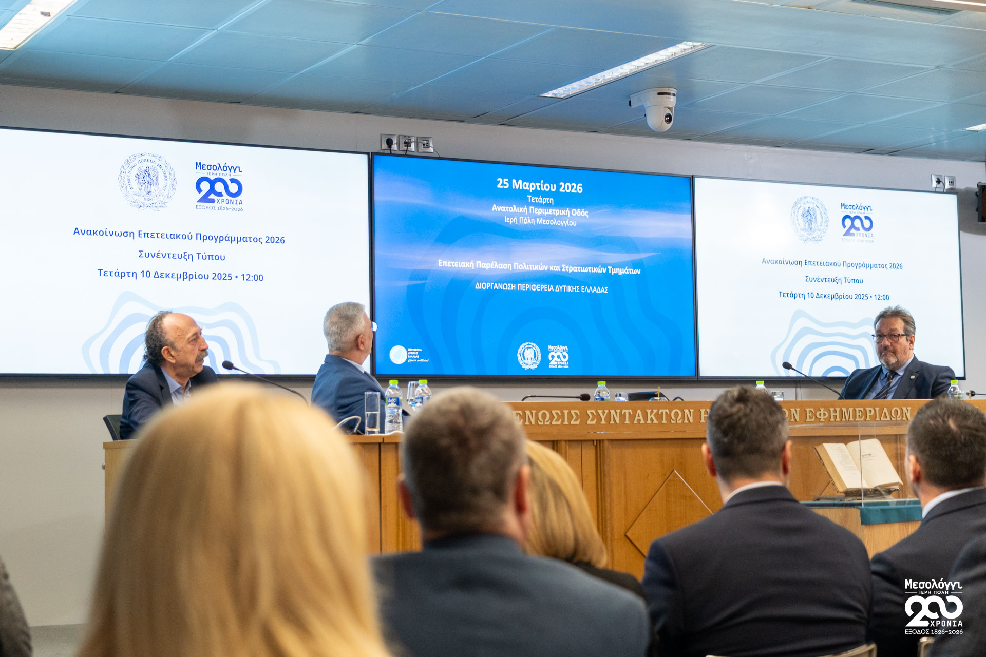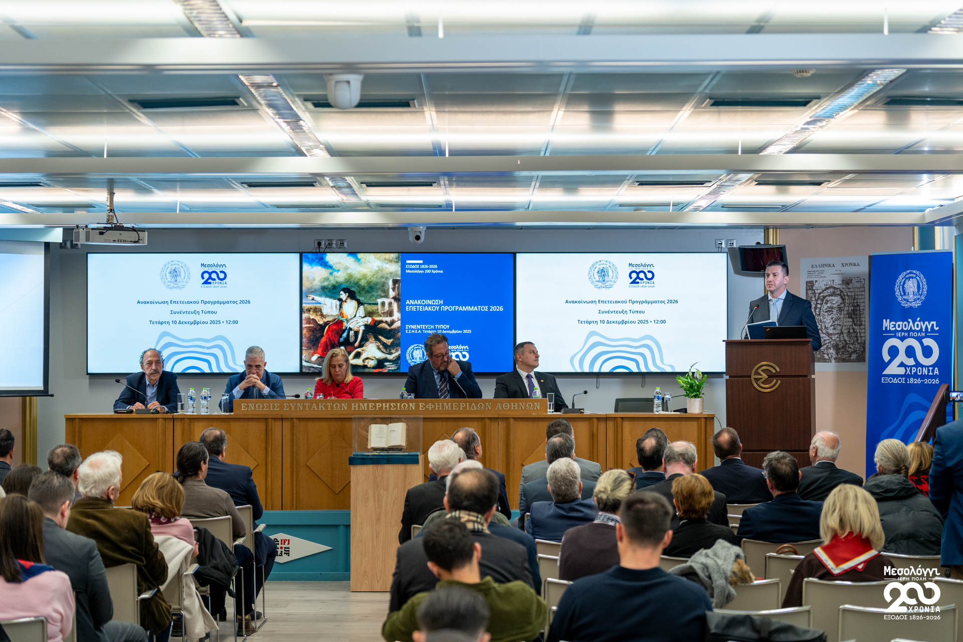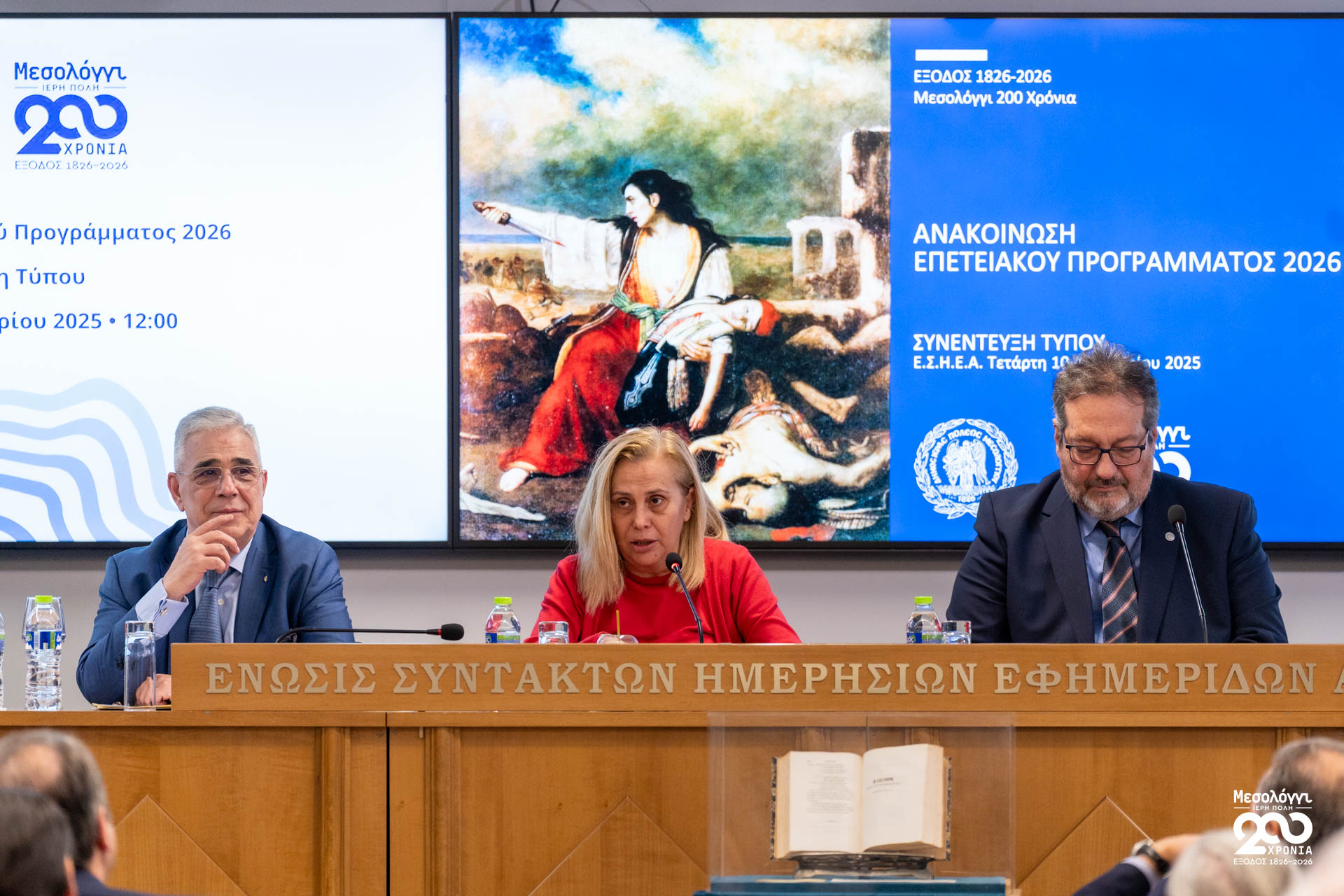 Σήμερα, Τετάρτη 10 Δεκεμβρίου 2025, στην αίθουσα «Γιώργος Καράντζας» της ΕΣΗΕΑ, πραγματοποιήθηκε συνέντευξη Τύπου του Δημάρχου Ιεράς Πόλεως Μεσολογγίου, Σπυρίδωνος Β. Διαμαντοπούλου, κατά την οποία παρουσιάστηκε το πρόγραμμα εκδηλώσεων για τη Διακοσιοστή Επέτειο της Εξόδου. Τη συνέντευξη Τύπου συντόνισε ο δημοσιογράφος Κωστής Τσιακανίκας, ενώ η εκδήλωση συνδιοργανώθηκε από τον Δήμο Ιεράς Πόλεως Μεσολογγίου, την ΕΣΗΕΑ και το Μορφωτικό Ίδρυμα της ΕΣΗΕΑ.