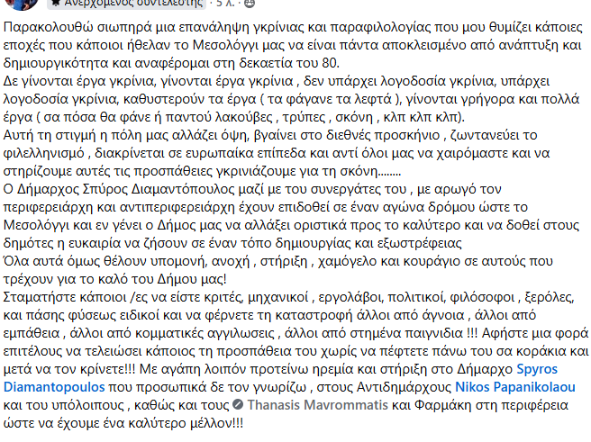 Η πόλη μας αλλάζει, αναδεικνύει τον φιλελληνισμό και διεκδικεί τη θέση που της αξίζει στην Ευρώπη, απαιτώντας από όλους μας υπομονή και ενεργή συμμετοχή. Απέναντι σε όσους βλέπουν μόνο προβλήματα και αποτυχία, εμείς προτάσσουμε την ενότητα και την προσπάθεια για έναν Δήμο δημιουργικό και δυναμικό. Είναι η στιγμή να αφήσουμε πίσω τους μόνιμους επικριτές και να γίνουμε όλοι μέρος της μεγάλης αλλαγής που έρχεται για το καλό του Μεσολογγίου.