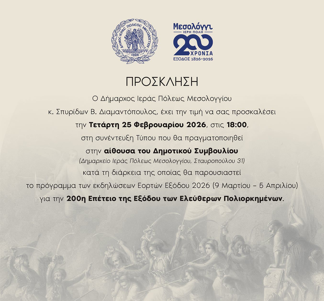 Κατά τη διάρκεια της συνέντευξης θα παρουσιαστεί το πρόγραμμα των Εορτών Εξόδου 2026 (9 Μαρτίου – 5 Απριλίου), για την 200ή Επέτειο της Εξόδου των Ελεύθερων Πολιορκημένων.