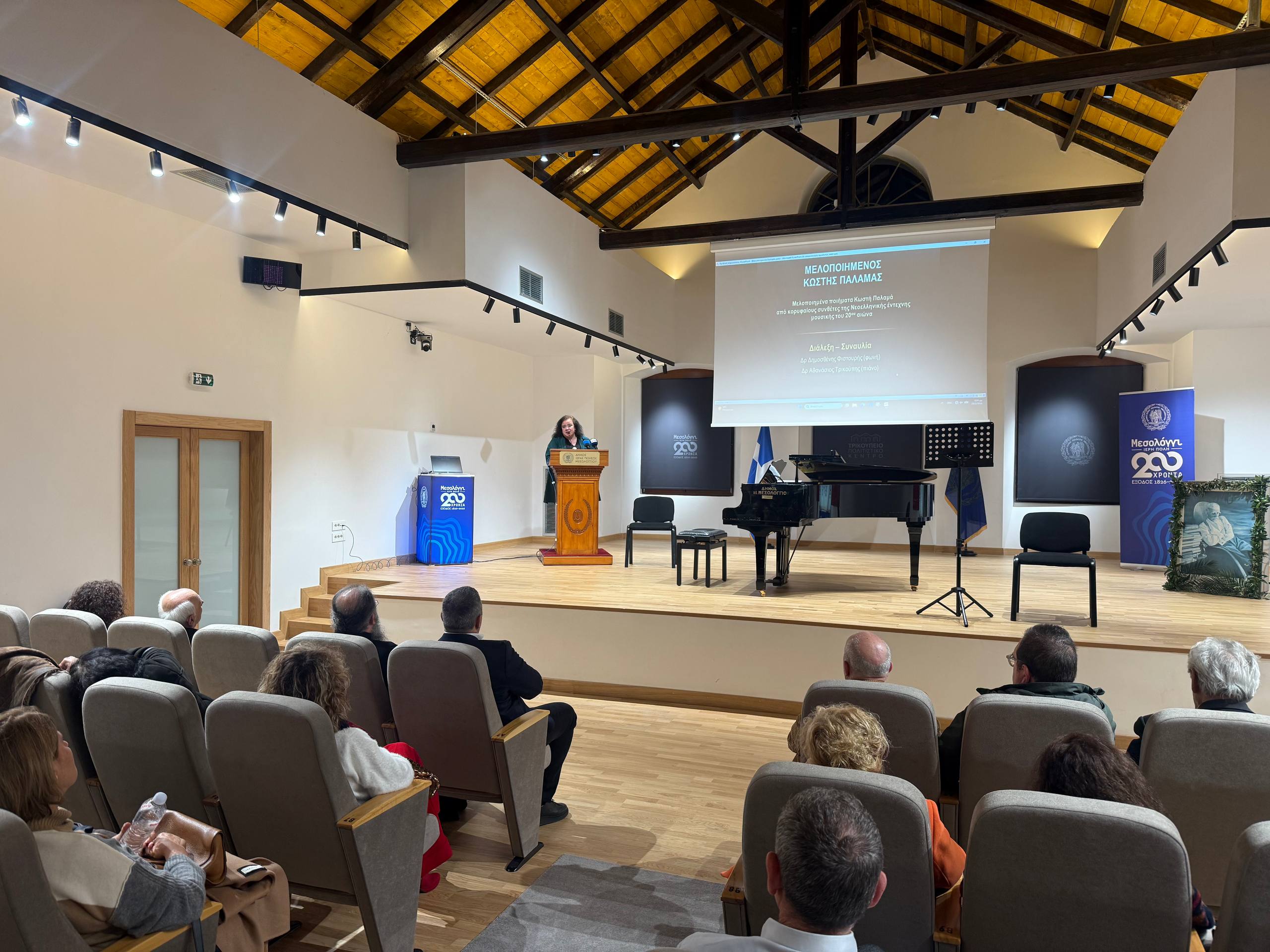 Με ιδιαίτερη επιτυχία και σε κλίμα βαθιάς πνευματικότητας πραγματοποιήθηκε την Τετάρτη, 25 Φεβρουαρίου 2026, στο Τρικούπειο Πολιτιστικό Κέντρο του Μεσολογγίου, η μουσικοφιλολογική βραδιά αφιερωμένη στον εθνικό μας ποιητή Κωστή Παλαμά. Η εκδήλωση έλαβε χώρα με αφορμή την επέτειο του θανάτου του μεγάλου δημιουργού, τιμώντας την αδιάρρηκτη σχέση του με την Ιερή Πόλη.