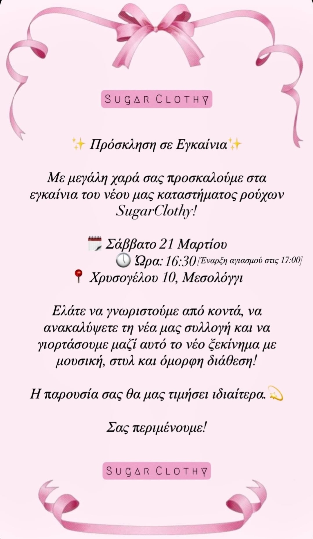 Με μεγάλη χαρά, το νέο κατάστημα ρούχων SugarClothy ανοίγει τις πόρτες του στο Μεσολόγγι και σας προσκαλεί στα εγκαίνιά του για ένα ξεχωριστό απόγευμα γεμάτο στυλ και μόδα!