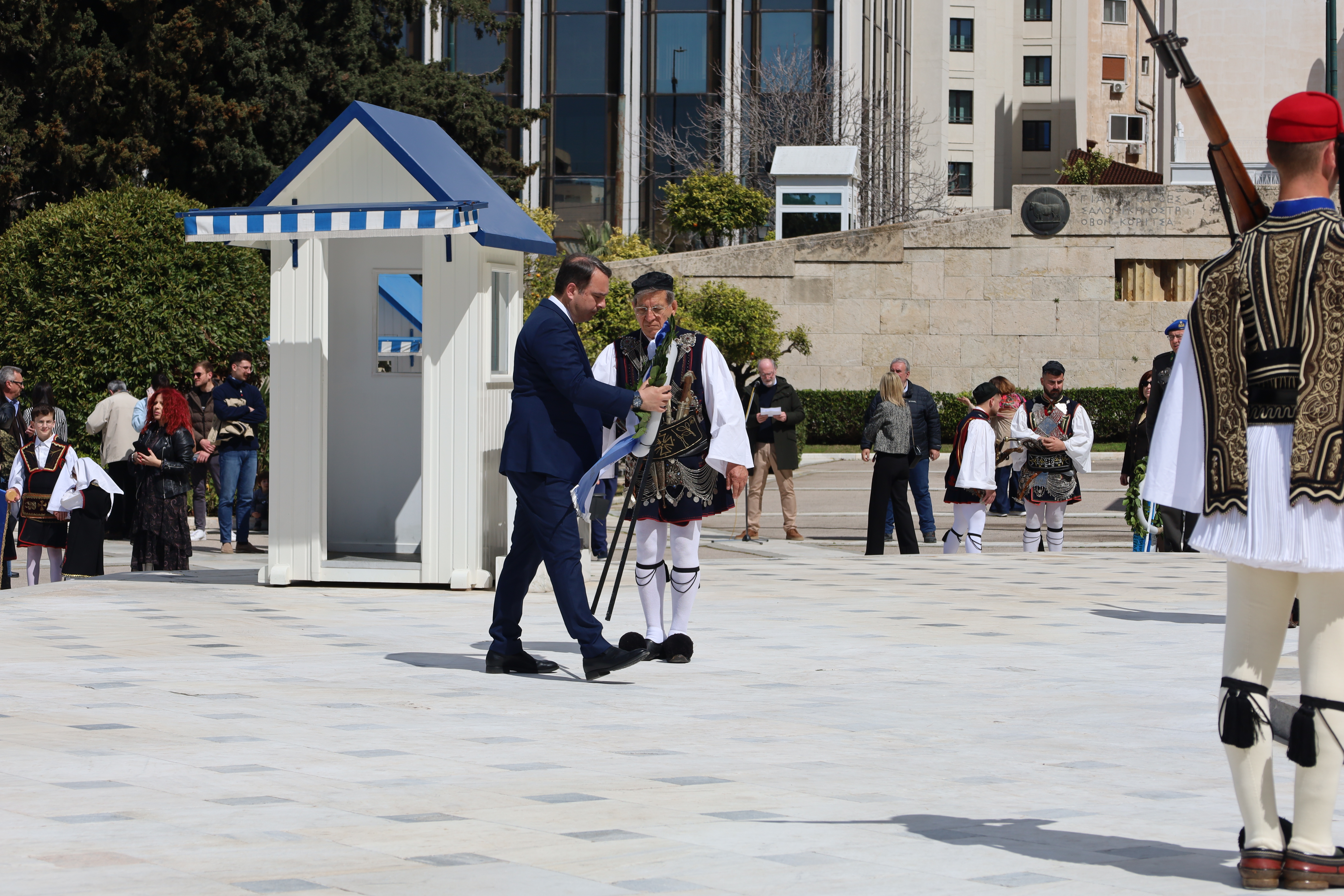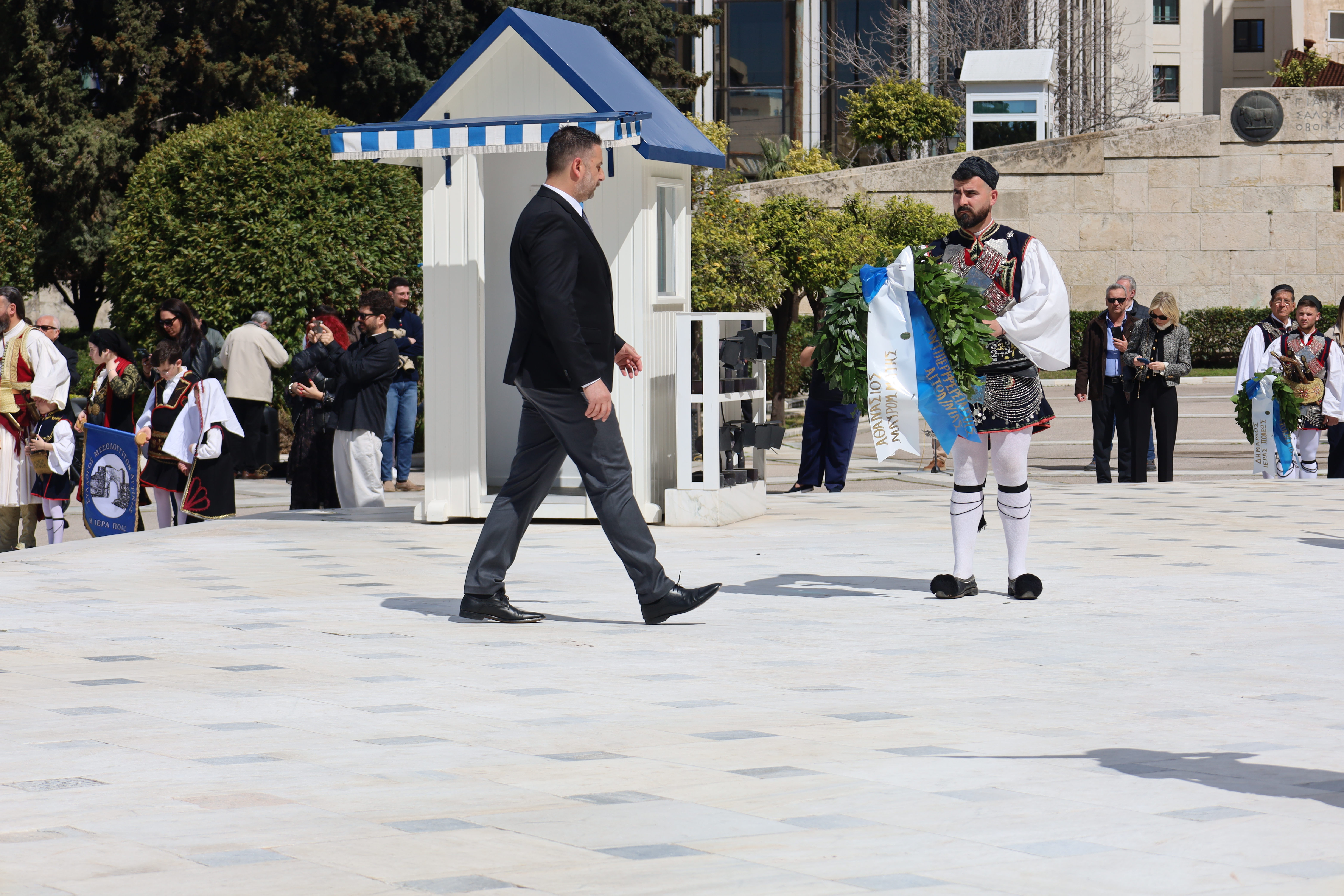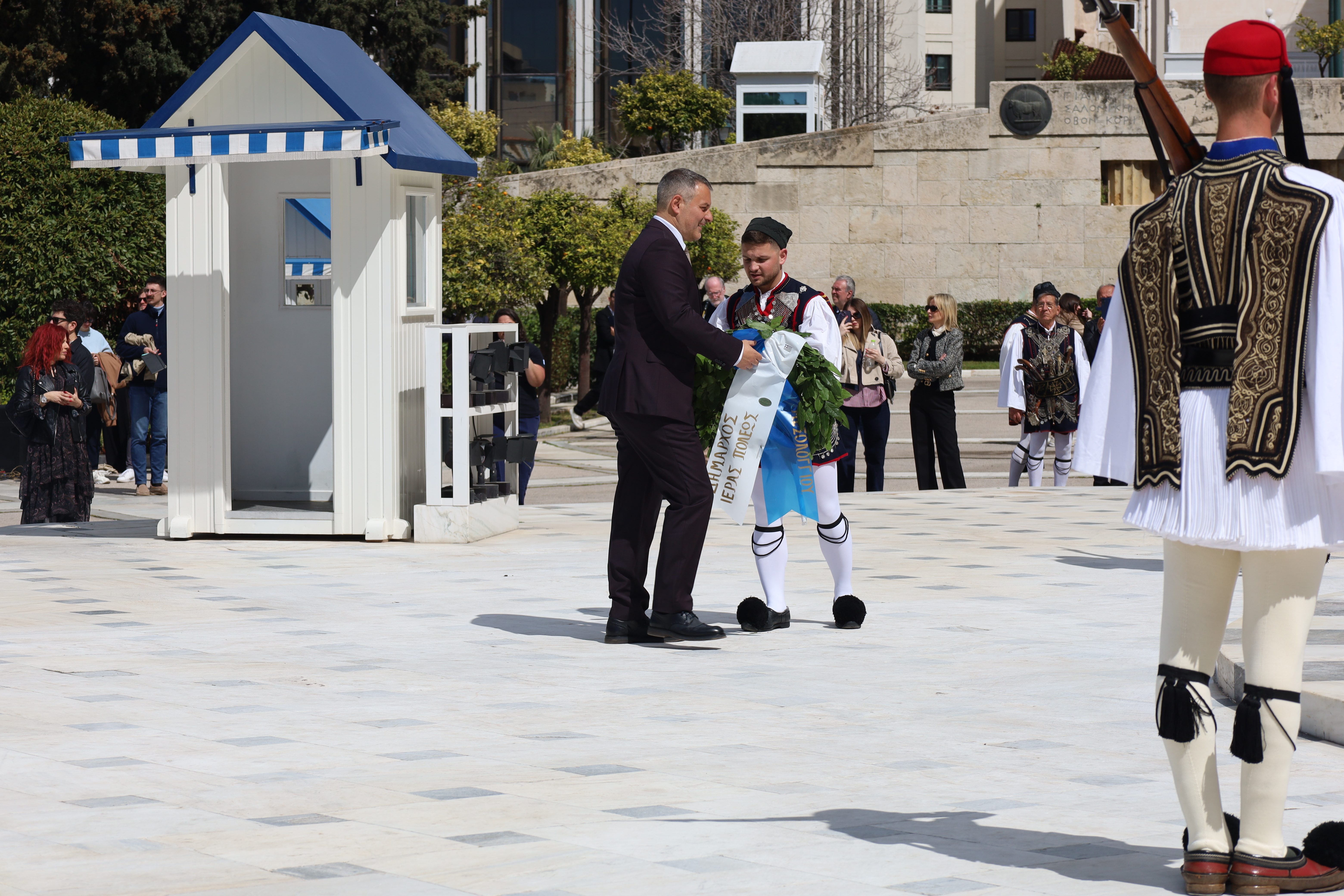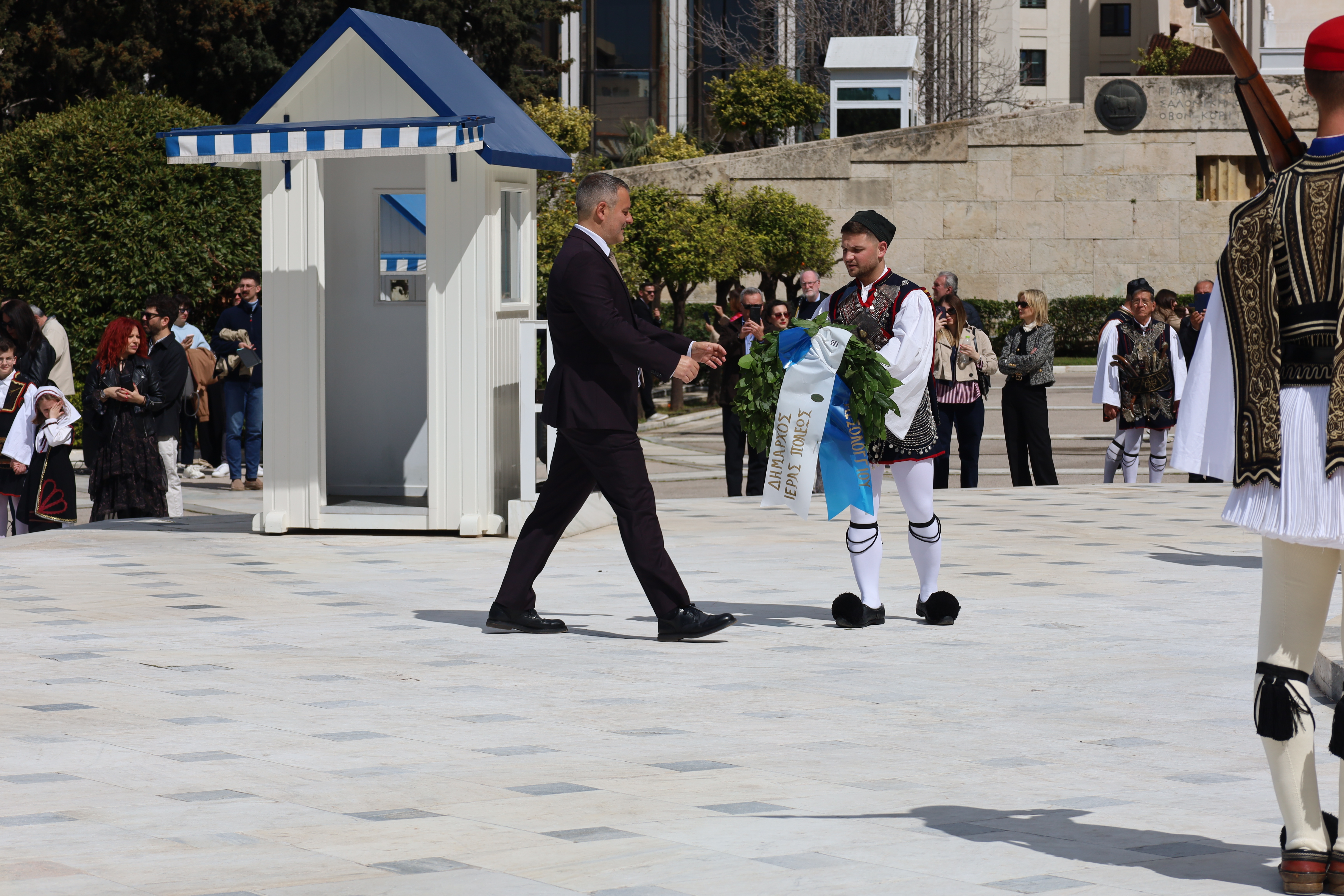 Ακολούθως, άπαντες, εν πομπή κατευθύνθηκαν προς το Μνημείο του Αγνώστου Στρατιώτου για την κατάθεση στεφάνων, με τη συνοδεία της Φιλαρμονικής του Δήμου Ιεράς Πόλεως Μεσολογγίου «Χρήστος Καψάλης», υπό τη Διεύθυνση του Αρχιμουσικού κ. Δημήτρη Τσιάντα και με την συνοδεία τιμητικού αγήματος του Συλλόγου Πανηγυριστών «Ο Άη–Συμιός» και μελών Συλλόγων με παραδοσιακές φορεσιές.