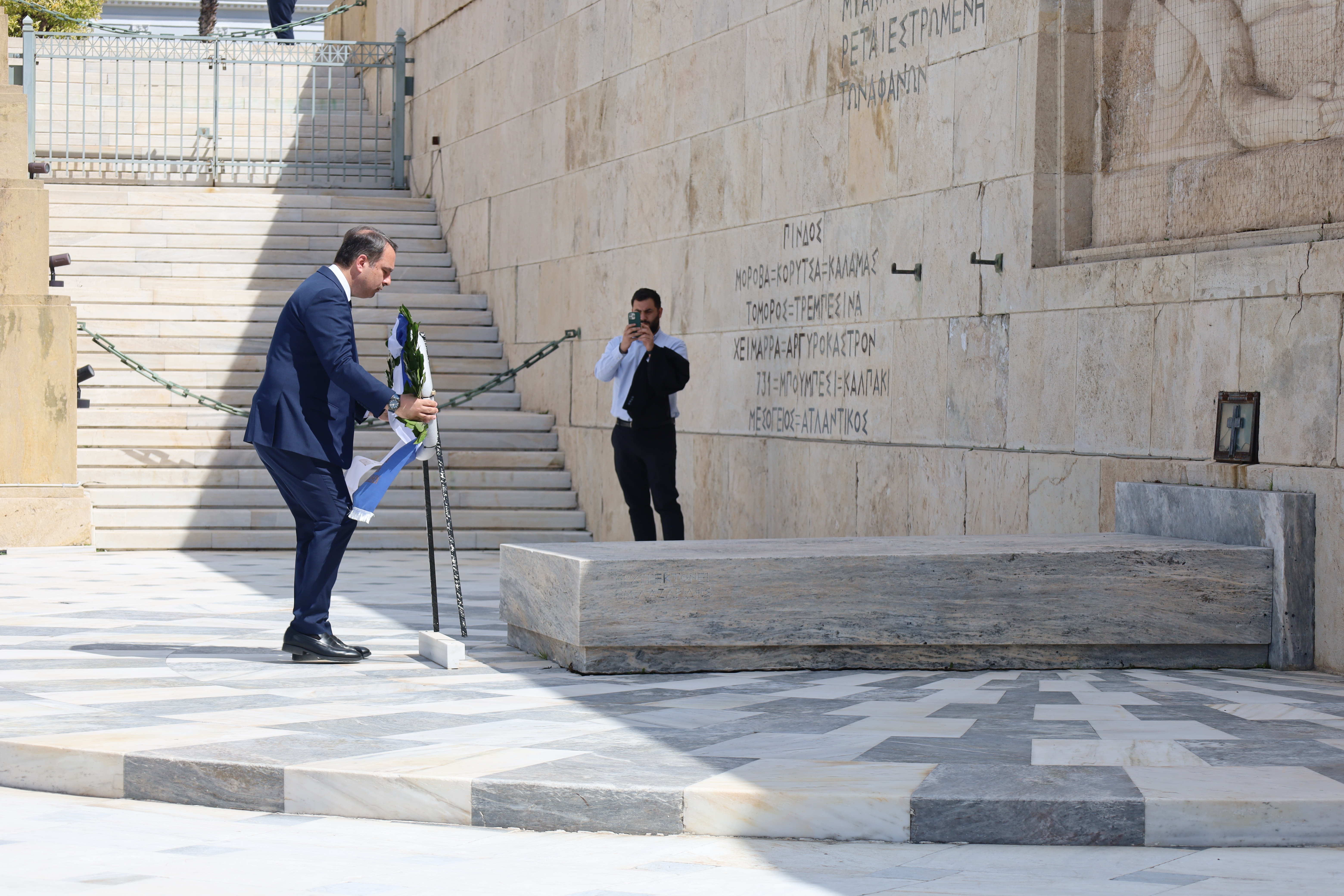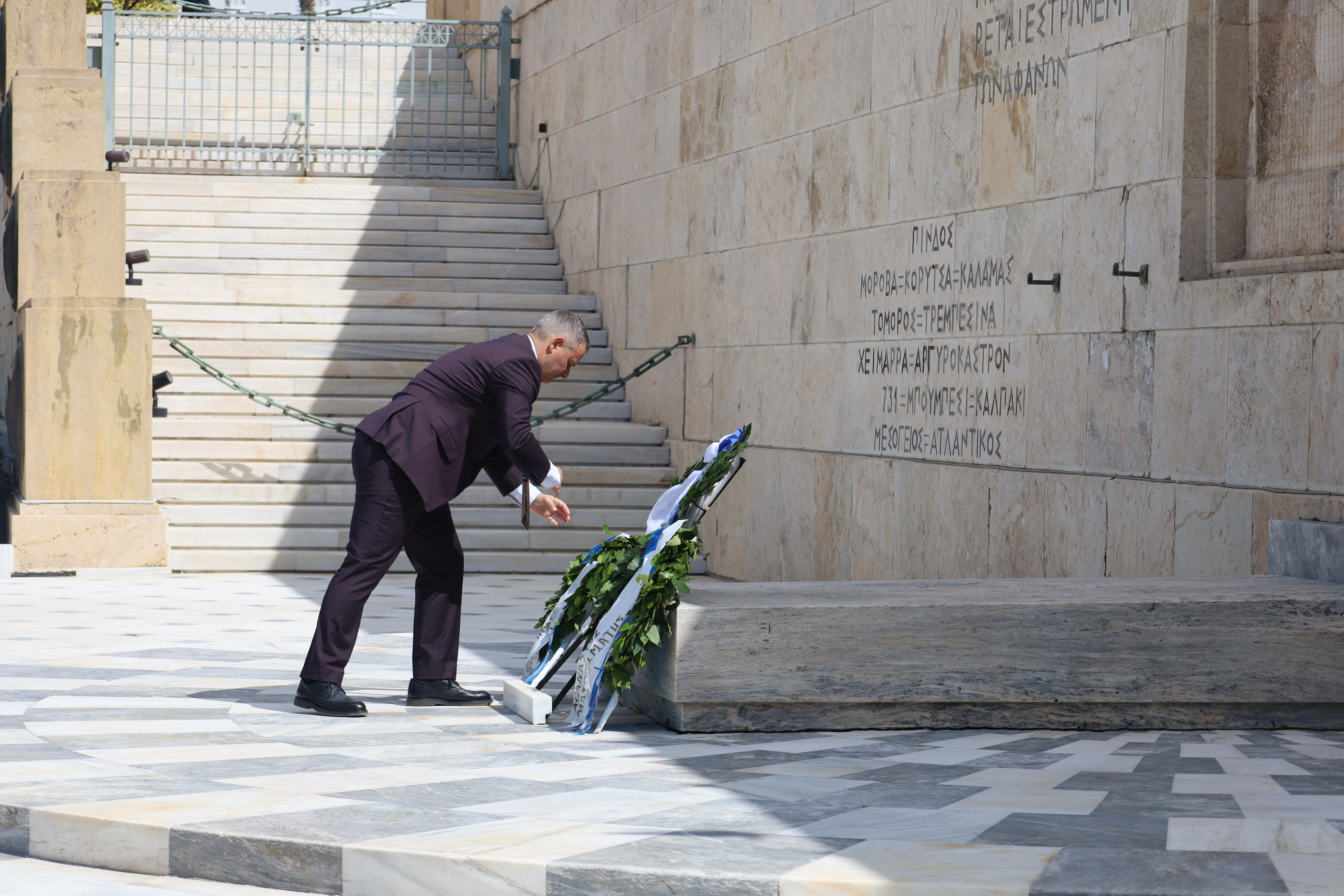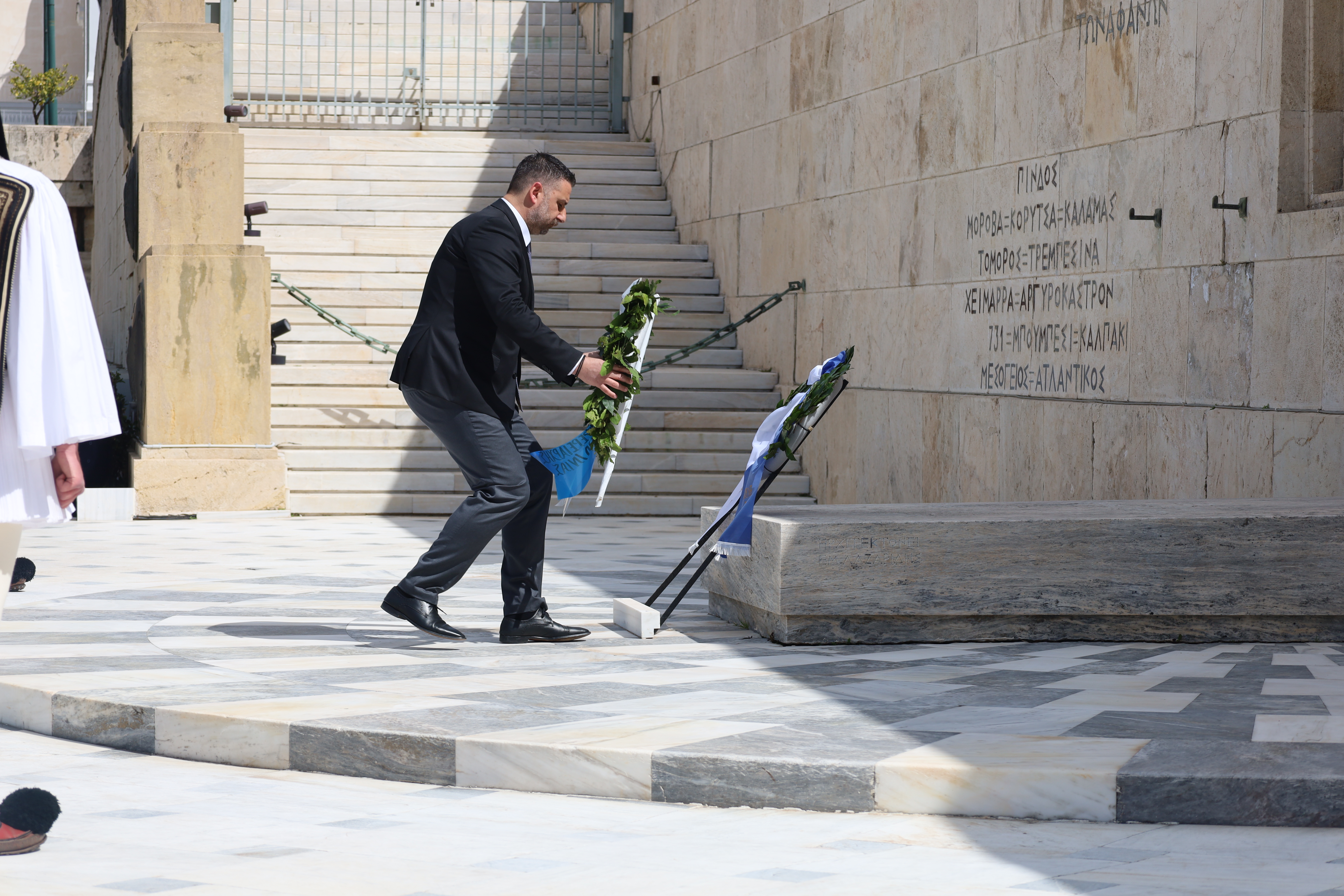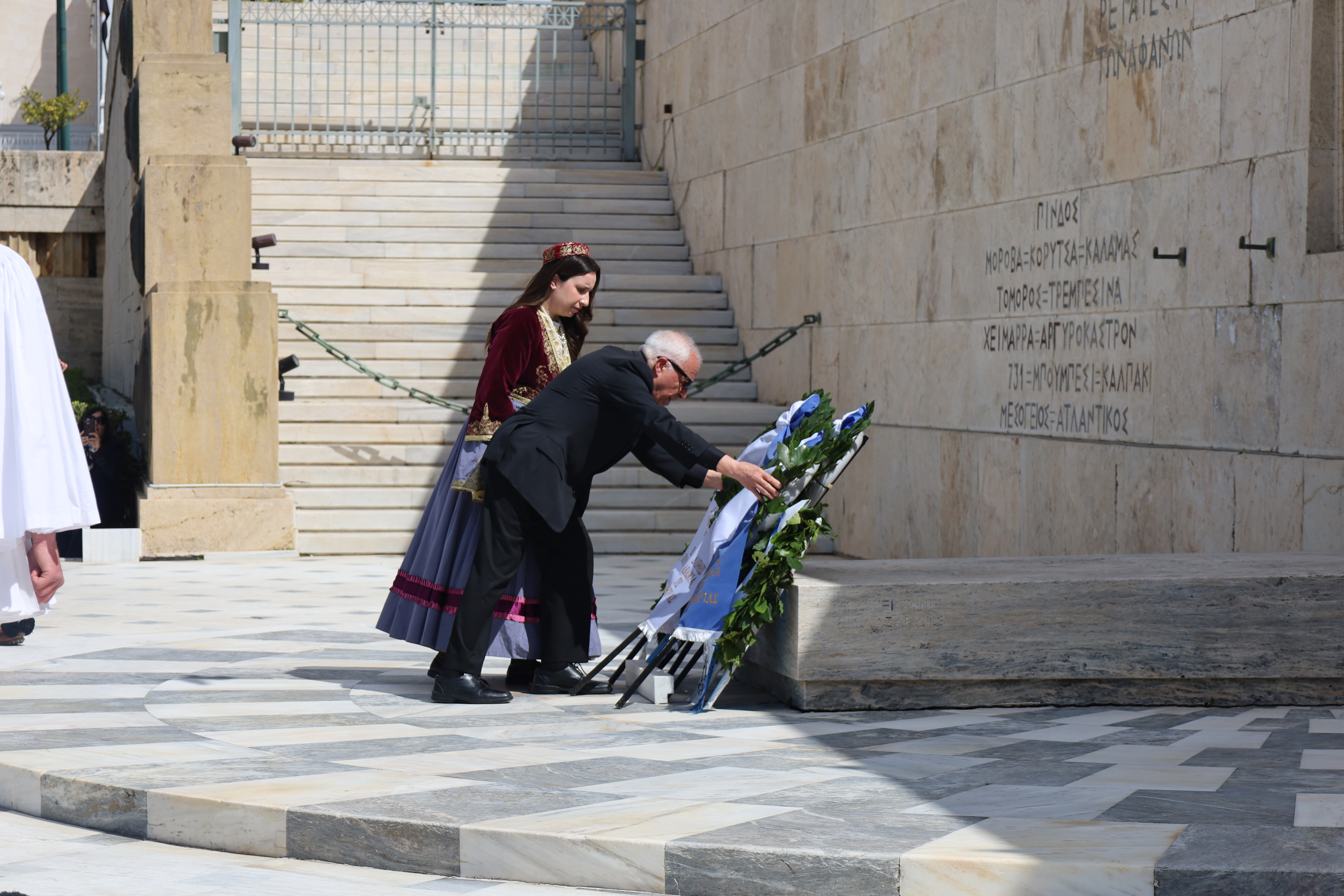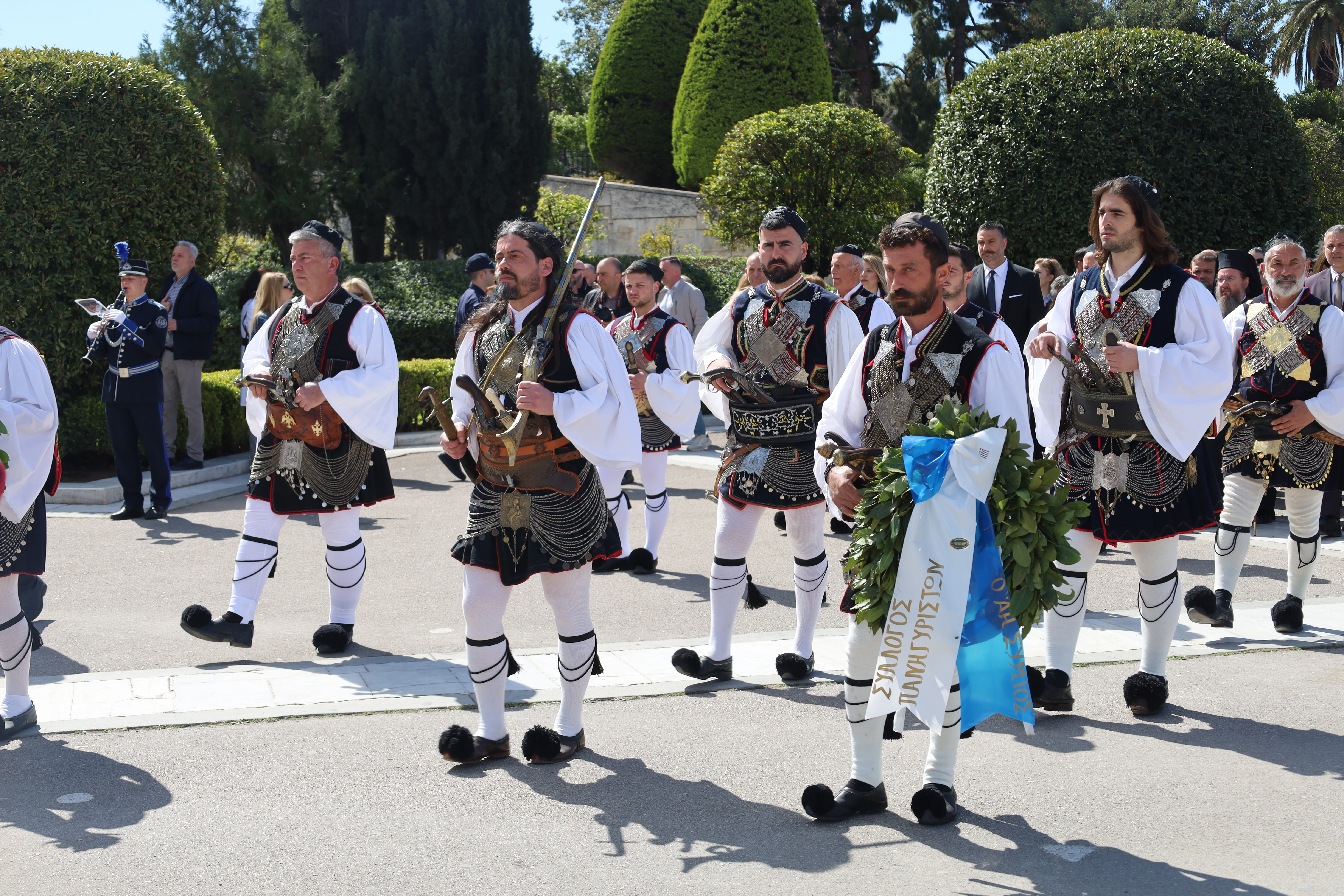 Ακολούθως, άπαντες, εν πομπή κατευθύνθηκαν προς το Μνημείο του Αγνώστου Στρατιώτου για την κατάθεση στεφάνων, με τη συνοδεία της Φιλαρμονικής του Δήμου Ιεράς Πόλεως Μεσολογγίου «Χρήστος Καψάλης», υπό τη Διεύθυνση του Αρχιμουσικού κ. Δημήτρη Τσιάντα και με την συνοδεία τιμητικού αγήματος του Συλλόγου Πανηγυριστών «Ο Άη–Συμιός» και μελών Συλλόγων με παραδοσιακές φορεσιές.