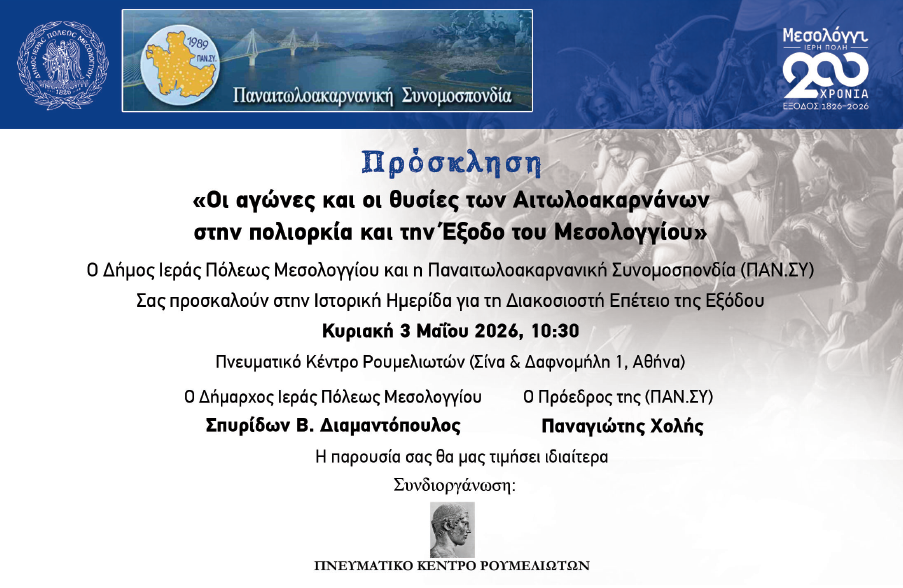 Η εκδήλωση, με τίτλο «Οι αγώνες και οι θυσίες των Αιτωλοακαρνάνων στην πολιορκία και την Ηρωική Έξοδο του Μεσολογγίου», θα πραγματοποιηθεί την Κυριακή 3 Μαΐου 2026 και ώρα 10:30 π.μ., στο Πνευματικό Κέντρο Ρουμελιωτών (Σίνα & Δαφνομήλη 1).